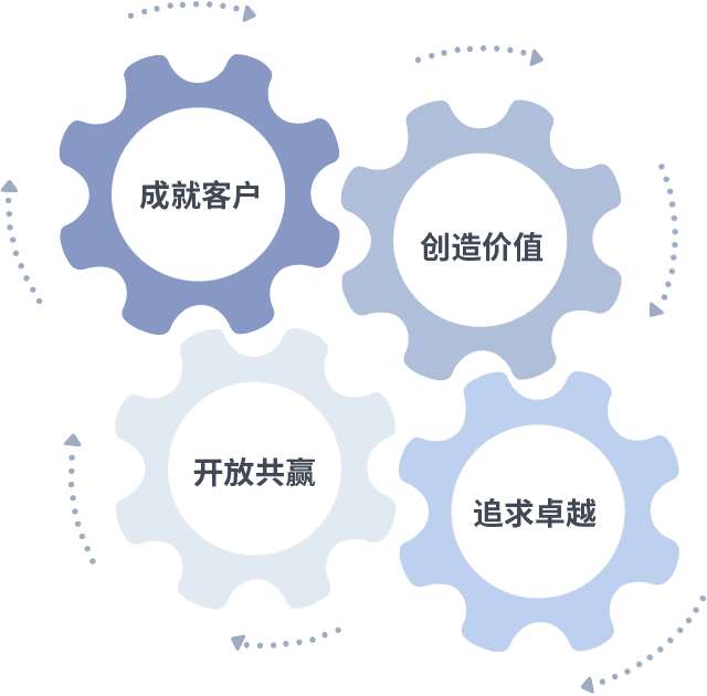 成就客户是一切决策的出发点,,,,创造价值是衡量所有工作的标准,,,追求卓越是我们做事做人的态度,,开放共赢是我们的格局也是最终的结果。。。价值观的齿轮环环相扣,,,,推动着组织里的每个人不断向前。。